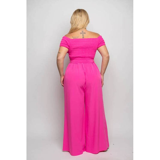 PLUS SIZE SMOCKED OFF SHOULDER WIDE LEG JUMPSUIT