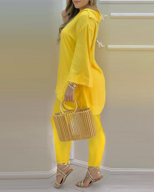 Plain Bell Sleeve V-Neck Top & Pants Set, Yellow