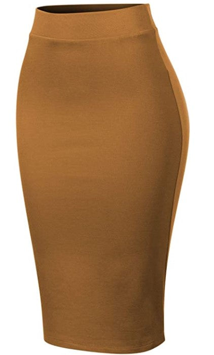 This elgeant coffee-colored skirt is form-fitting and puts the 'class' in "Classic".